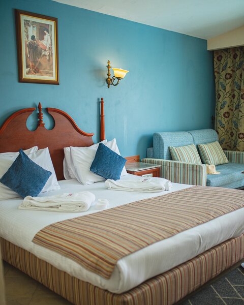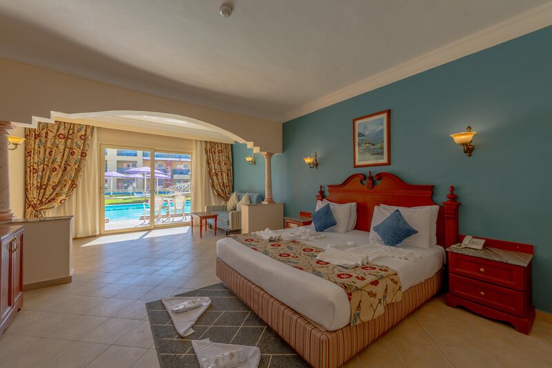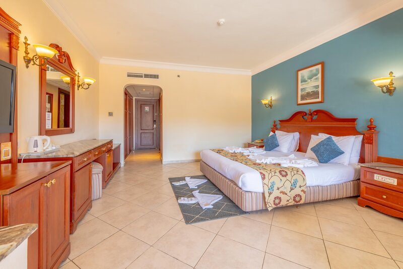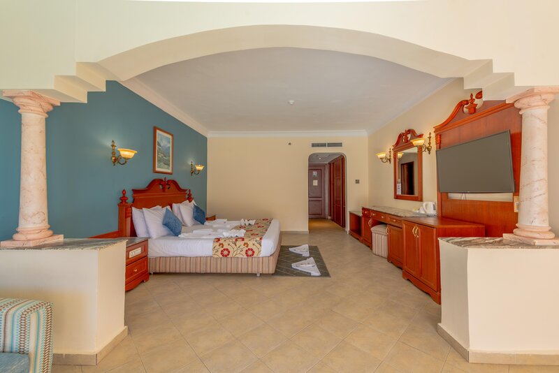 Die modernen ausgestatteten im Doppelzimmer Haupthaus (DZ/EZ/TZ) sind mit Dusche/Bad, WC, Föhn, Klimaanlage, Telefon, Sat.-TV, Safe, Minibar, Balkon/Terrasse ausgestattet. Die Bungalowzimmer (BDZ) verfügen über dieselbe Ausstattung. In den Familienzimmer (FZ/FZ3) hat man einen Schlafraum mit ca. 55 m2, ein Kingsize Bett, 2 weitere Betten, Dusche/Bad, WC, Föhn, Klimaanlage, Telefon, Sat.-TV, Safe, Minibar und Balkon/Terrasse. Zudem steht eine geringe Anzahl an Sparzimmern (DZP) zur Verfügung.