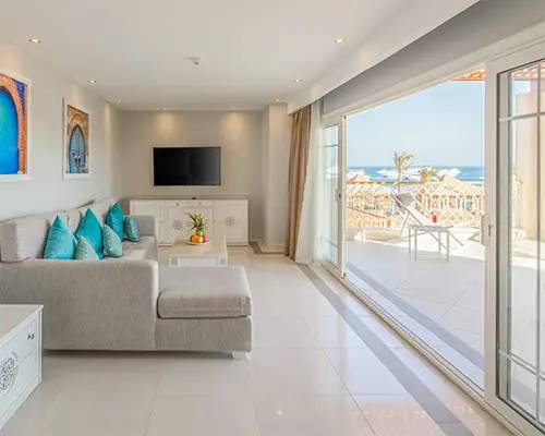 Die Suiten teilen sich auf in 2 Suiten mit Verbindungstür (Wohnzimmer + Schlafzimmer), 4 Suiten mit Gartenblick und 3 Suiten mit Meerblick, 2 Balkone, Klimaanlage saisonal, begehbare Dusche, Ankleidebereich, Kingsize-Bett, Satellitenfernsehen, Minibar mit kostenlosen alkoholfreien Getränken, kostenloser Safe, Haartrockner, Telefon, Telefon im WC, max. 2 Erwachsene.