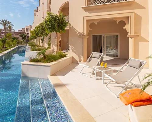 - Die Juniorsuiten im Erdgeschoss haben einen direkten Zugang zum Swimmingpool von der Terrasse.